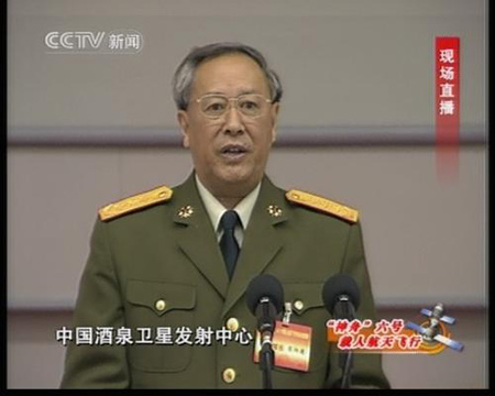 陳炳德:尊敬的胡總書記、溫總理,各位領導、各位來賓,同志們,根據(jù)航天城的測量結(jié)果,我現(xiàn)在鄭重宣布,神舟六號載人飛船發(fā)射取得圓滿成功。
