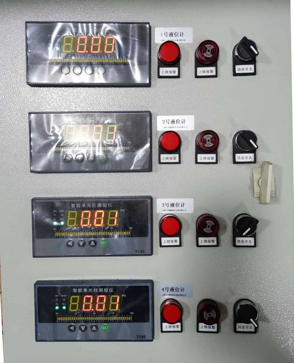 控制柜內(nèi)部嵌入有多個液位變聲器控制主機(jī),該主機(jī)能實時采集液位變送器的數(shù)據(jù),并更加設(shè)定的報警閾值給出 上下限閾值聲光報警的功能